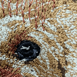 使用したのはポリエステル刺繍糸約5色。毛並みの流れを表現するため、同系色を重ねて自然なグラデーションを出すように配置しました。