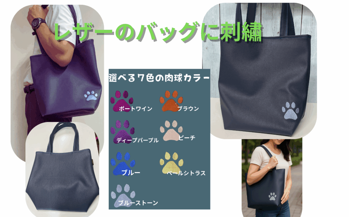 この度、新商品として「肉球刺繍レザートートバッグ」が完成いたしましたので、ご紹介させていただきます。
